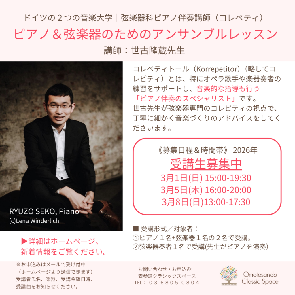 世古先生は、ドイツの二つの音楽大学の弦楽器科で伴奏講師を務め、日々学生の伴奏をしながら音楽づくりのアドバイスをされています。
